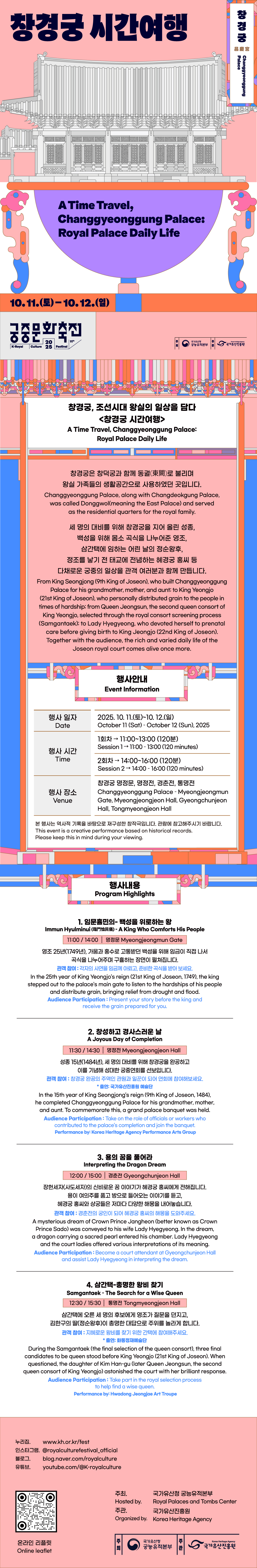 관객 참여 : 창경궁 완공의 주역인 관원과 일꾼이 되어 연회에 참여해보세요. *출연 : 국가유산진흥원 예술단